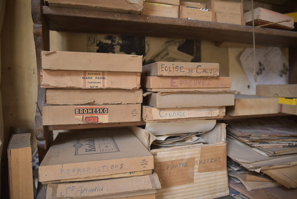 C’est dans la petite pièce à l’arrière que repose une grande partie du fonds René Brousses. Une dizaine d’appareils photographiques anciens se mêle aux archives, aux nombreuses boîtes de plaques de verre, tracts publicitaires et matériels de bricolage.